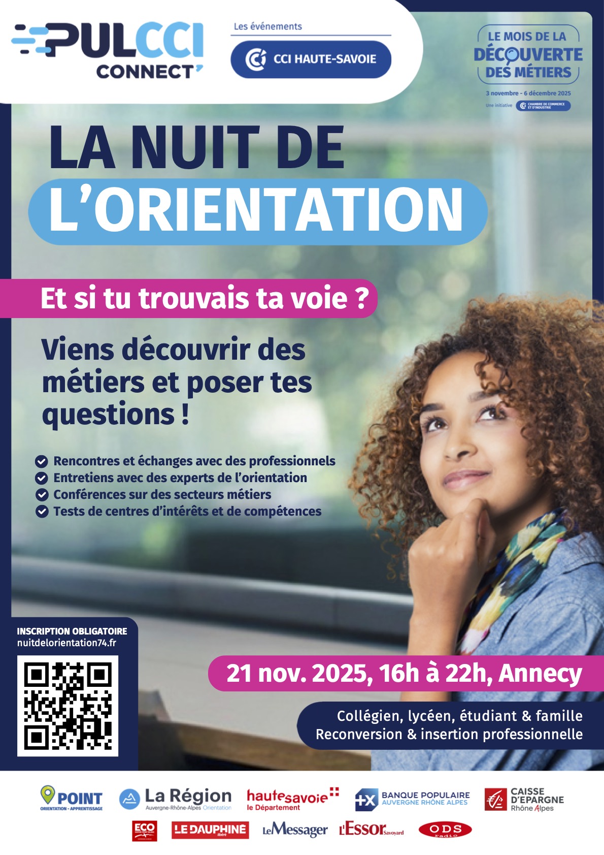 Le vendredi 21 novembre prochain, la CCI de Haute-Savoie vous invite à participer à la Nuit de l’Orientation au cinéma Mégarama d’Annecy. Que vous soyez collégien, lycéen, étudiant ou en reconversion, venez échanger avec des professionnels de divers secteurs et profiter de conseils personnalisés. Découvrez différents métiers et affinez votre projet d’avenir grâce à des outils d’orientation adaptés.