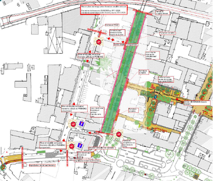 - La rue est à double sens pour permettre l'accès au chantier du Tramway, la rue de la Gare étant par ailleurs en travaux d'aménagement de voirie depuis le 23 juin.